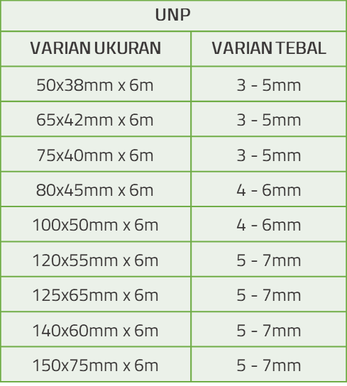 Sedangkan UNP adalah besi panjang dengan bentuk penampang yang menyerupai huruf U. Dikenal juga sebagai Kanal U, Profil U, dan U-Channel, besi ini banyak digunakan sebagai penutup dinding (girts), penutup dudukan atap (purin), dan rangka komponen konstruksi